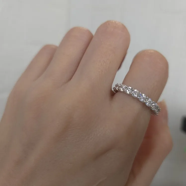 Crafted for those who appreciate timeless elegance, this 2.2 Carat Full Circle Moissanite Ring embodies pure sophistication. Set in solid 925 sterling silver and plated with 18K white gold, it features a continuous row of 3mm D color VVS1 Moissanite stones, each hand-cut to perfection for maximum brilliance and fire.