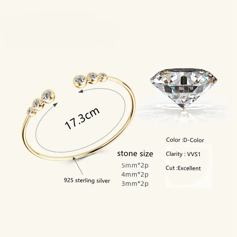 Crafted from 100% 925 sterling silver and plated in 18K white gold, this exquisite adjustable cuff bracelet features a total of 2.4 carats of D color, VVS1 Moissanite stones, each reflecting unparalleled brilliance and fire. Its sleek open design allows for a custom, comfortable fit, perfect for both daily elegance and evening sophistication.