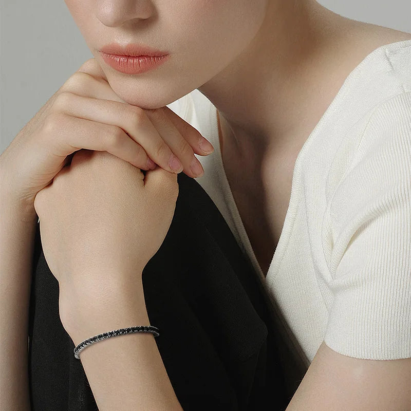 The Black Moissanite Tennis Bracelet from Oravé Éclat blends mystery with brilliance. Handcrafted from 100% 925 sterling silver and plated in 18K white gold, each bracelet features precision-cut black Moissanite stones—a striking twist on timeless luxury.