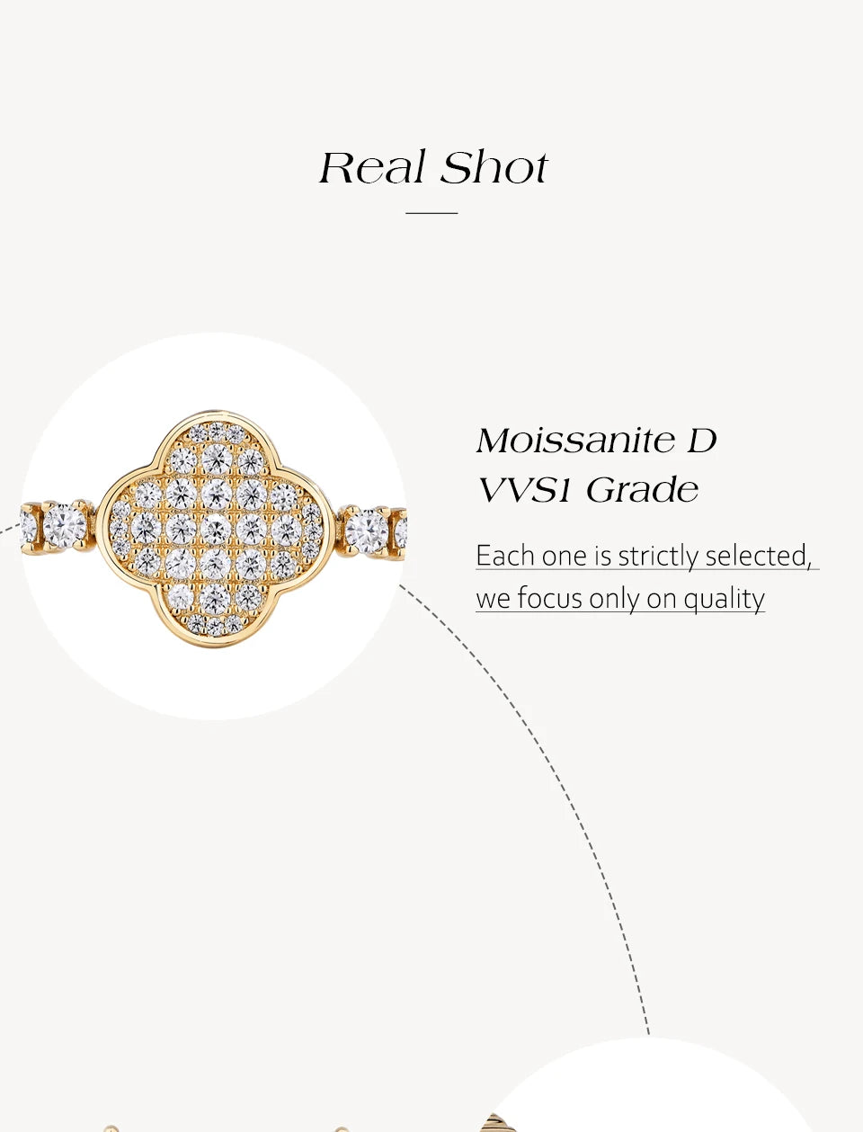Each clover link sparkles with D-color VVS1 moissanite diamonds, masterfully cut to perfection for maximum fire and clarity — indistinguishable from natural diamonds. The adjustable design ensures a perfect fit for every wrist, extending up to 24cm (9.45 inches), making it both graceful and versatile.
