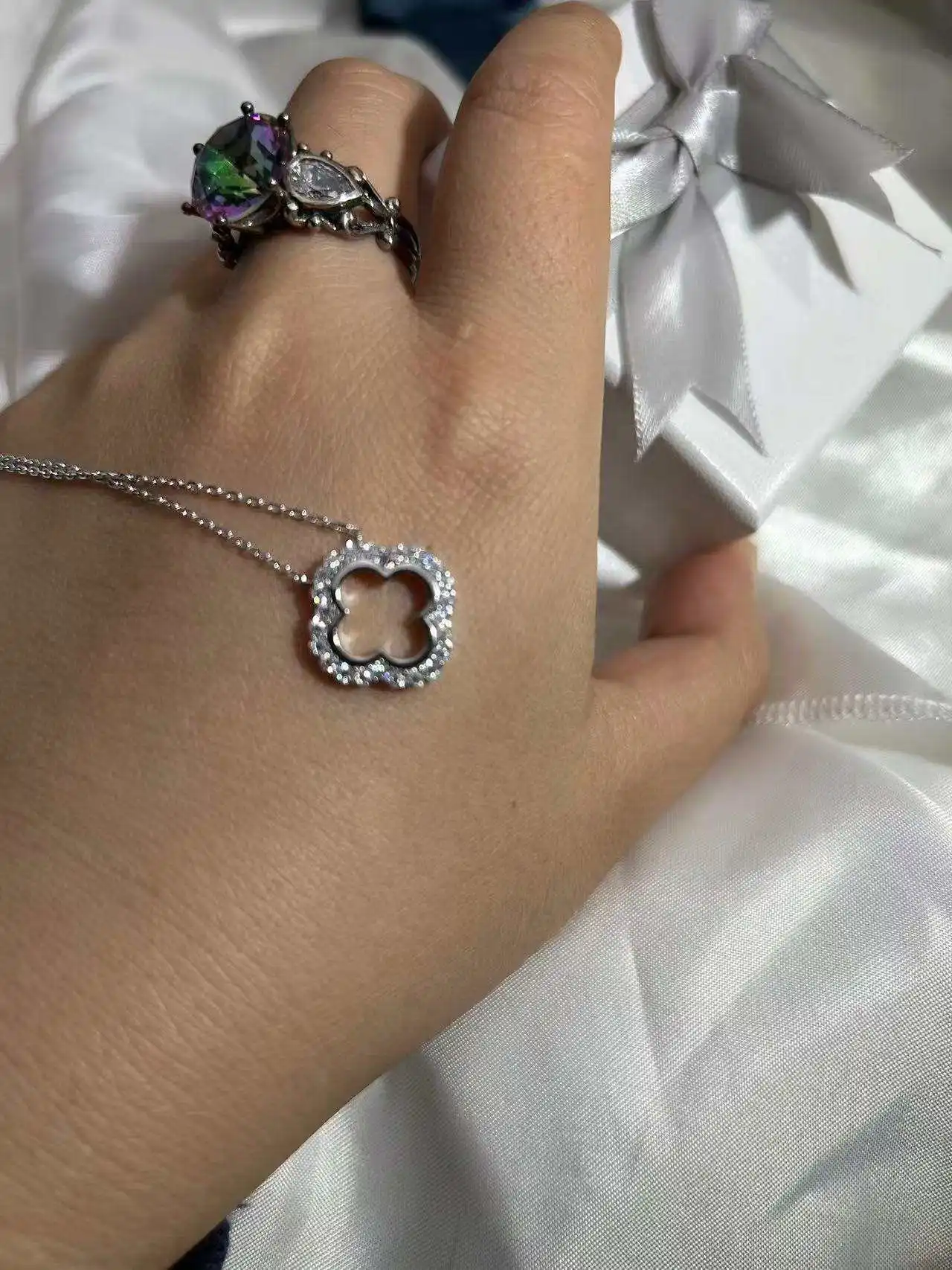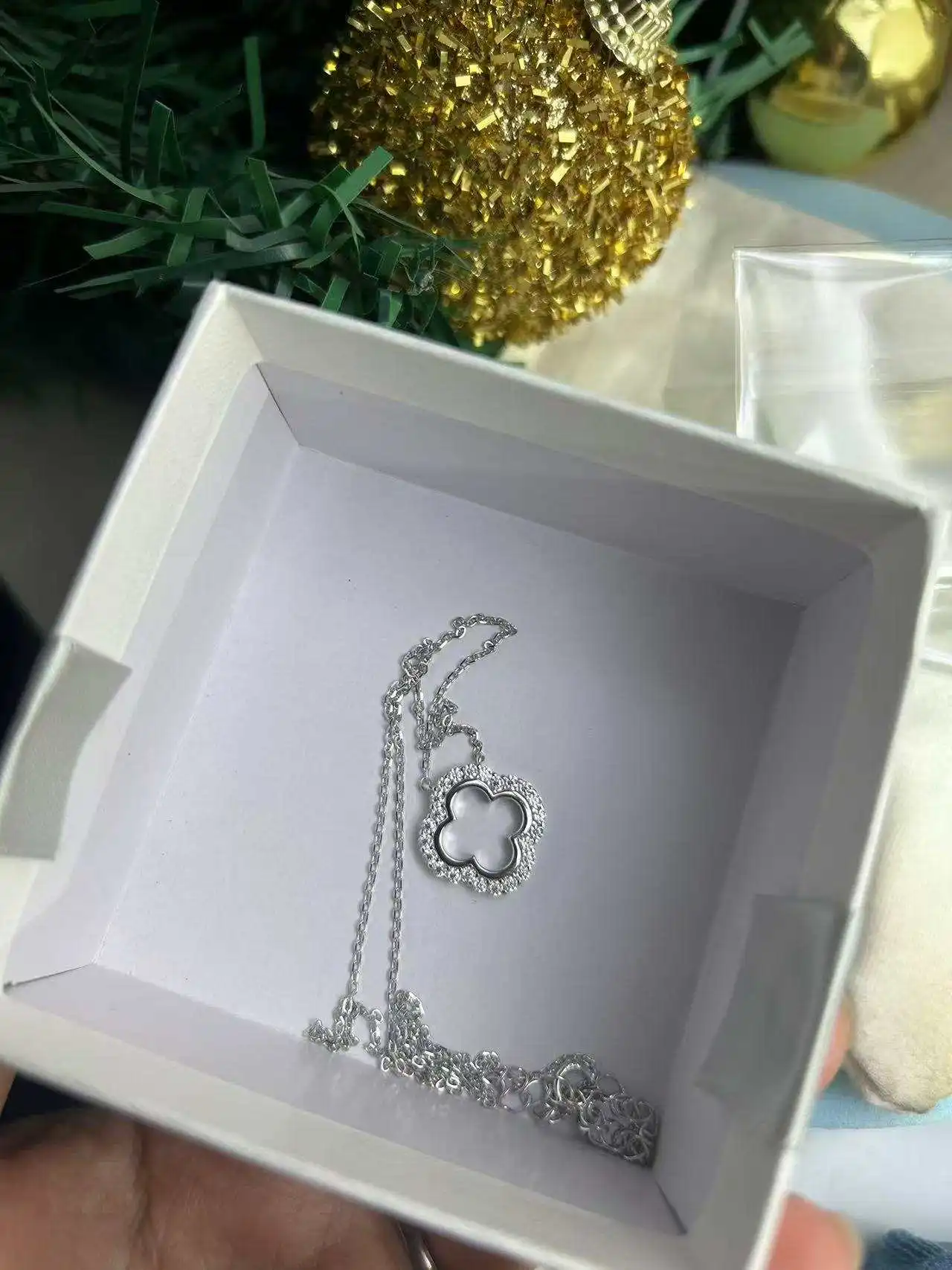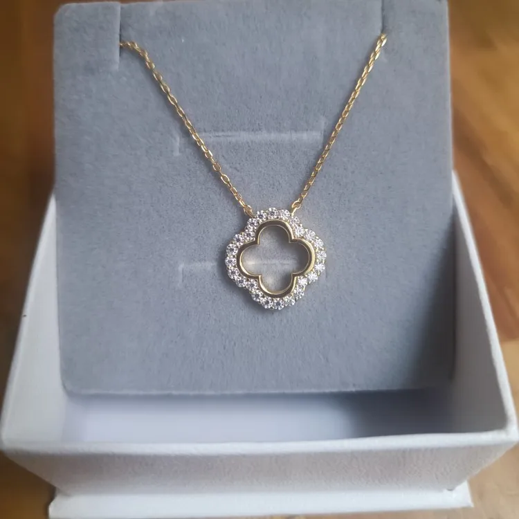 Elegant and full of meaning, this Four Leaf Clover Loop Moissanite Necklace symbolizes luck and everlasting beauty. Each clover shines with premium D-color VVS1 Moissanite, forming a continuous loop that reflects unity, grace, and charm. Plated in 18K gold over genuine 925 sterling silver, it offers a timeless radiance perfect for the festive season or any special occasion.