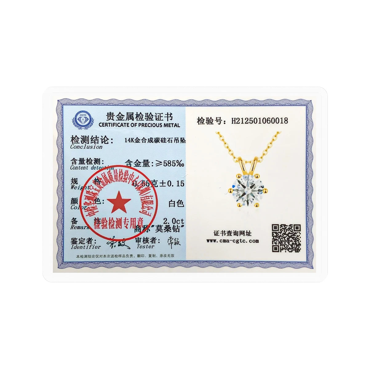 Choose from 1 Carat (6.5mm), 2 Carat (8mm), or 3 Carat (9mm) stones to suit your style — from understated elegance to bold brilliance. This pendant comes with both a 14K authenticity certificate and GRA certification for the Moissanite stone, ensuring its quality and diamond-equivalent brilliance.